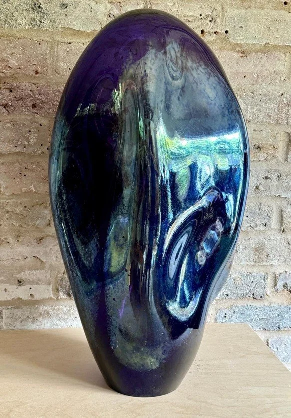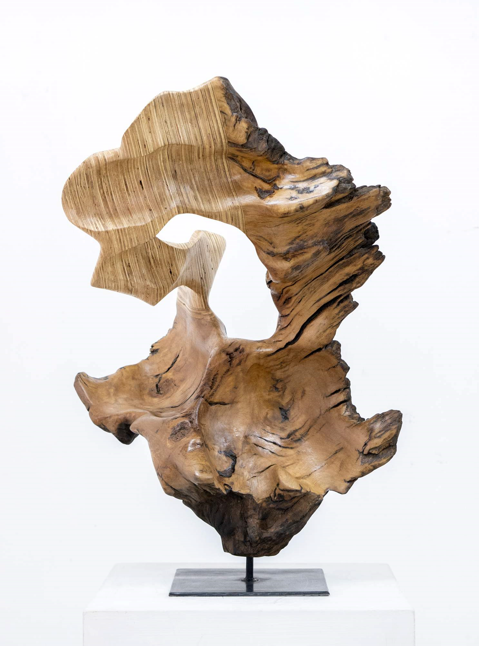 The wooden sculptures appear moulded from a single block of wood but are actually composed of as many as sixty handcrafted smaller slices of plywood. The ringed markings orbiting the surface of each segment represent an individual piece fused to form the whole. Ambaye has described this process as sculpting ‘from the inside out.’ These cyclical markings also conjure images of the naturally occurring concentric circles found in trees, signifying age, and life and death, as they are only visible once the tree has been cut down. Ambaye’s work has been included in numerous solo and group exhibitions across the United States, as well as in Abu Dhabi, Ghana, and Addis Ababa.